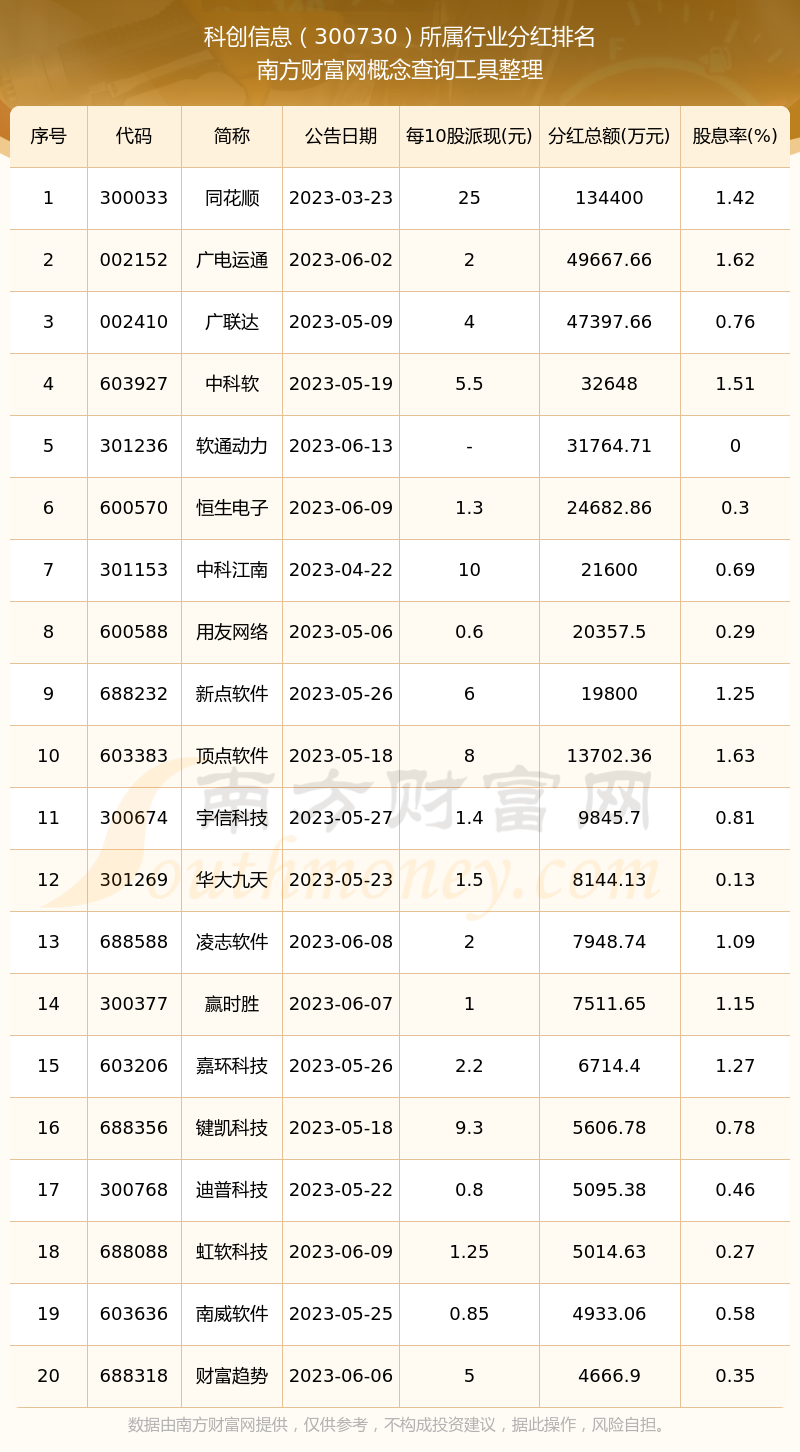 按照开云手机web版登录入口趋势选股系统统计,科创信息所属行业为软件开发行业,软件开发行业分红排名情况如下表:
