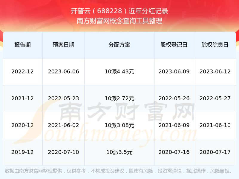 开普云最新一次公布的分红方案为10派4.43元。本次权益分派股权登记日为2023年6月9日,除权除息日为2023年6月12日,派息日为2023年6月12日。