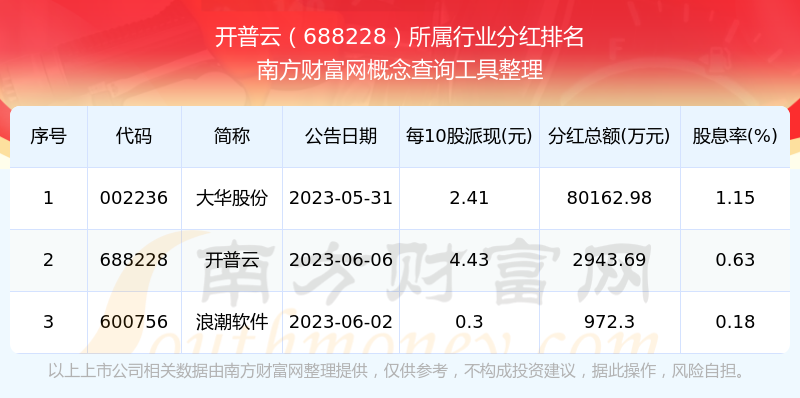 按照开云手机web版登录入口趋势选股系统统计,开普云所属行业为软件行业,软件行业分红排名情况如下表: