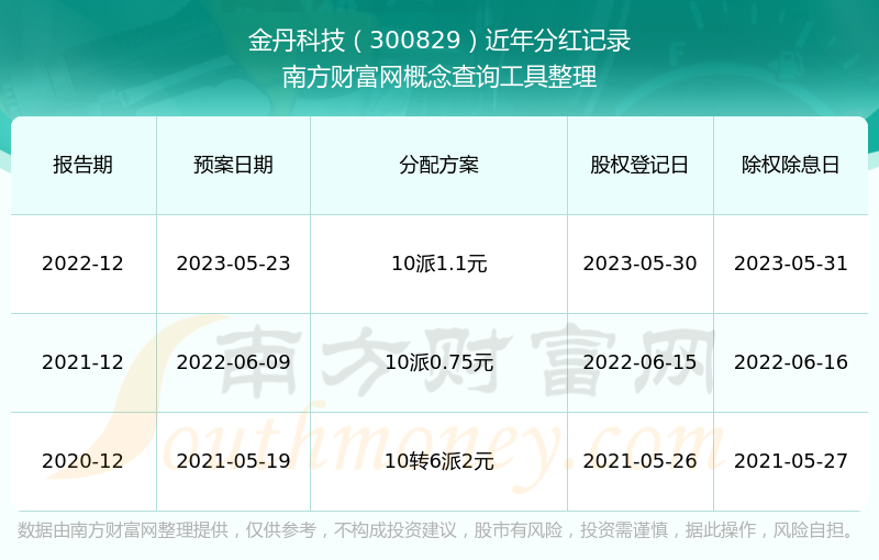 金丹科技最新一次公布的分红方案为10派1.1元。本次权益分派股权登记日为2023年5月30日,除权除息日为2023年5月31日,派息日为2023年5月31日。