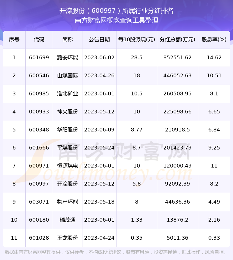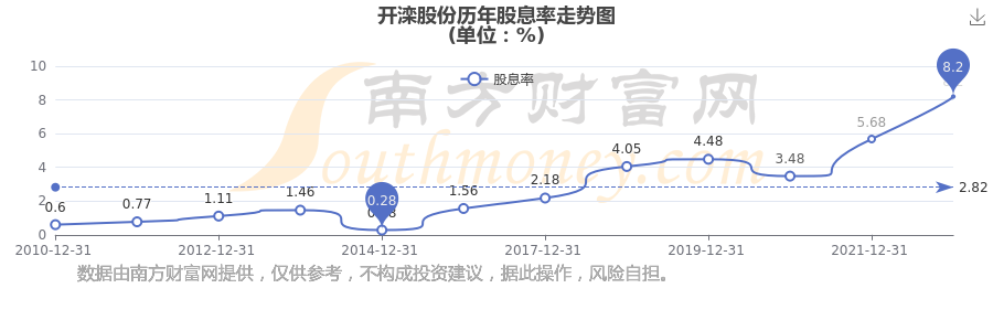 开滦股份最新一次公布的分红方案为10派5.8元。本次权益分派股权登记日为2023年5月17日,除权除息日为2023年5月18日,派息日为2023年5月18日。