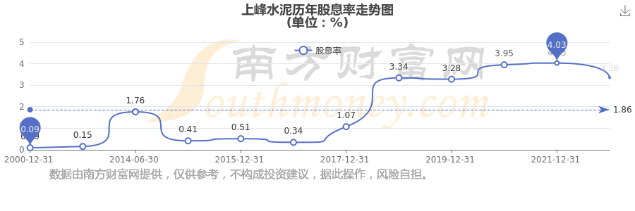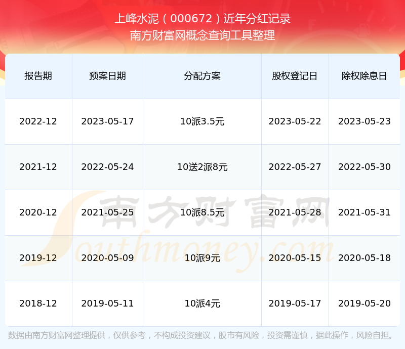 上峰水泥最新一次公布的分红方案为10派3.5元。本次权益分派股权登记日为2023年5月22日,除权除息日为2023年5月23日,派息日为2023年5月23日。