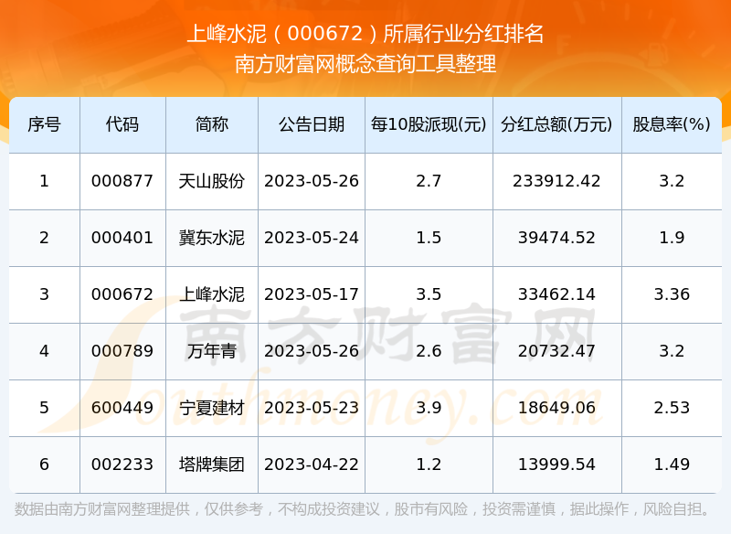 按照开云手机web版登录入口趋势选股系统统计,上峰水泥所属行业为水泥建材行业,水泥建材行业分红排名情况如下表: