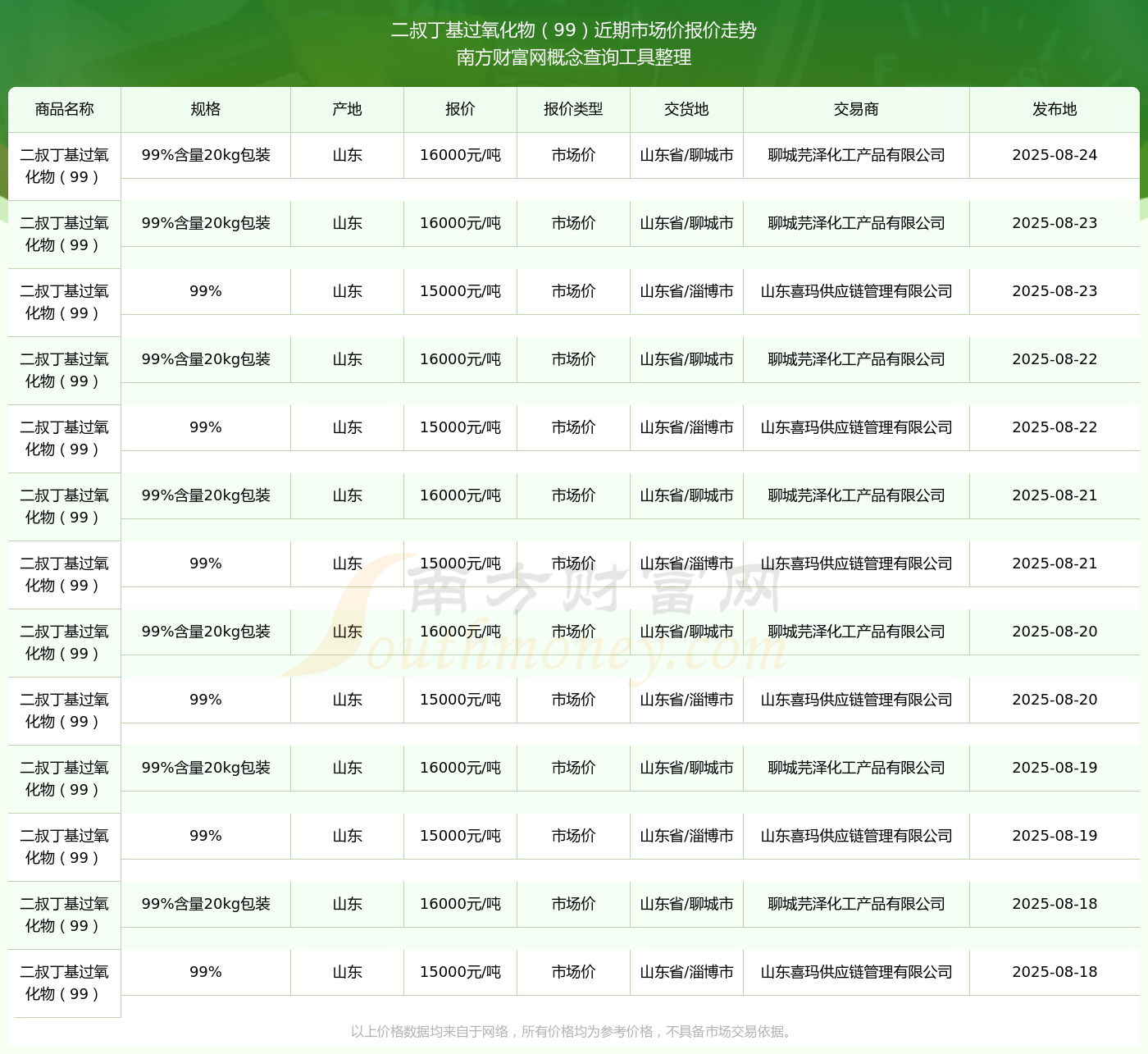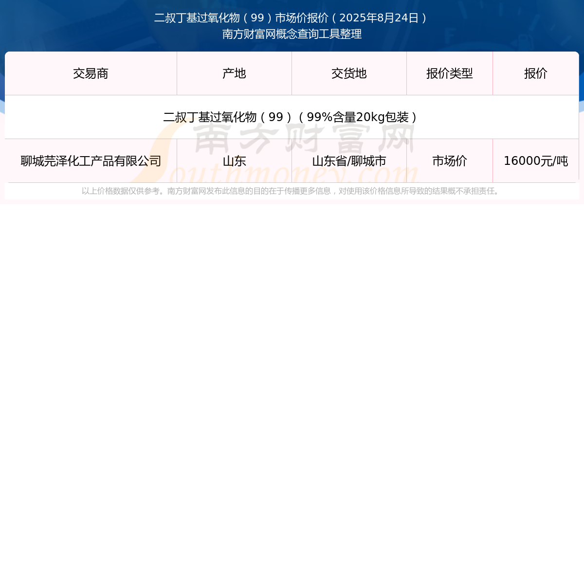 2025年8月24日,聊城芫泽化工产品有限公司二叔丁基过氧化物(99)(99%含量20kg包装),山东,交易地点为山东省/聊城市,市场价报价为16000.00元/吨。