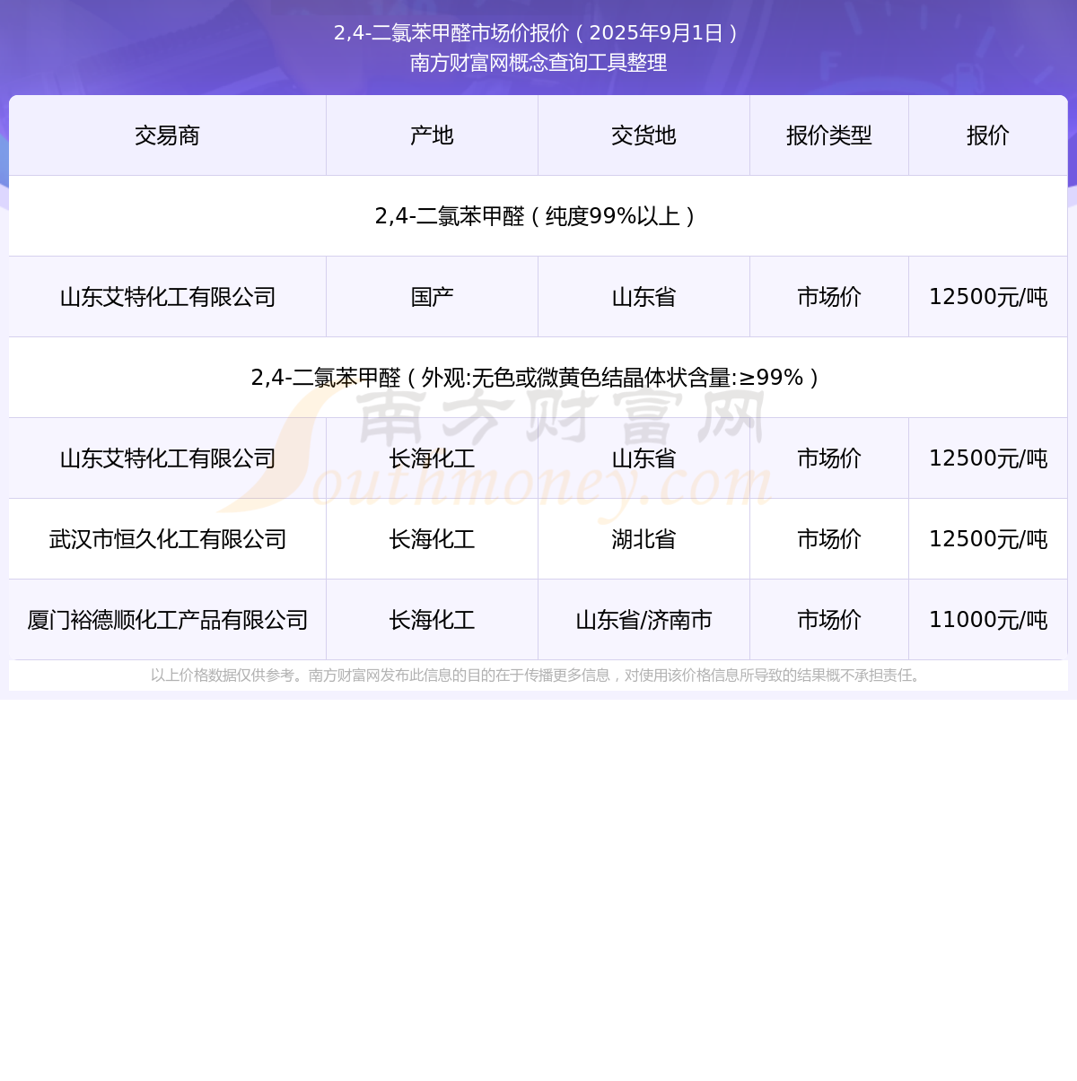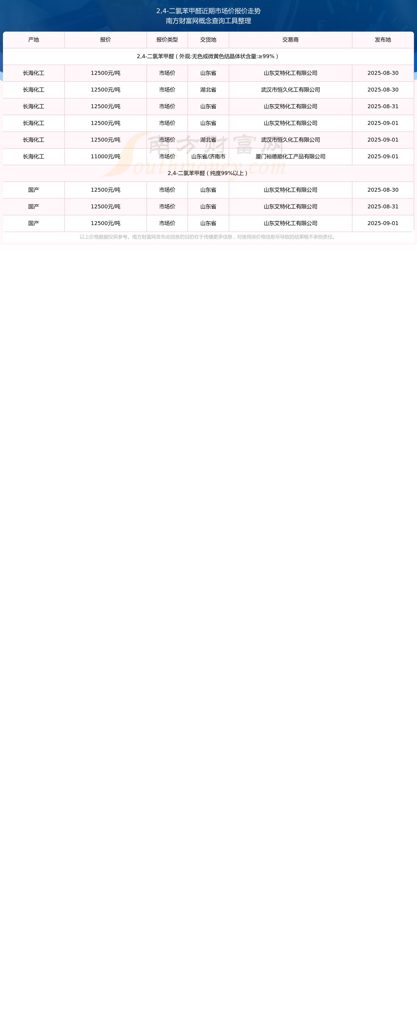 2025年9月1日,山东艾特化工有限公司2,4-二氯苯甲醛(外观:无色或微黄色结晶体状含量:≥99%),长海化工,交易地点为山东省,市场价报价为12500.00元/吨。