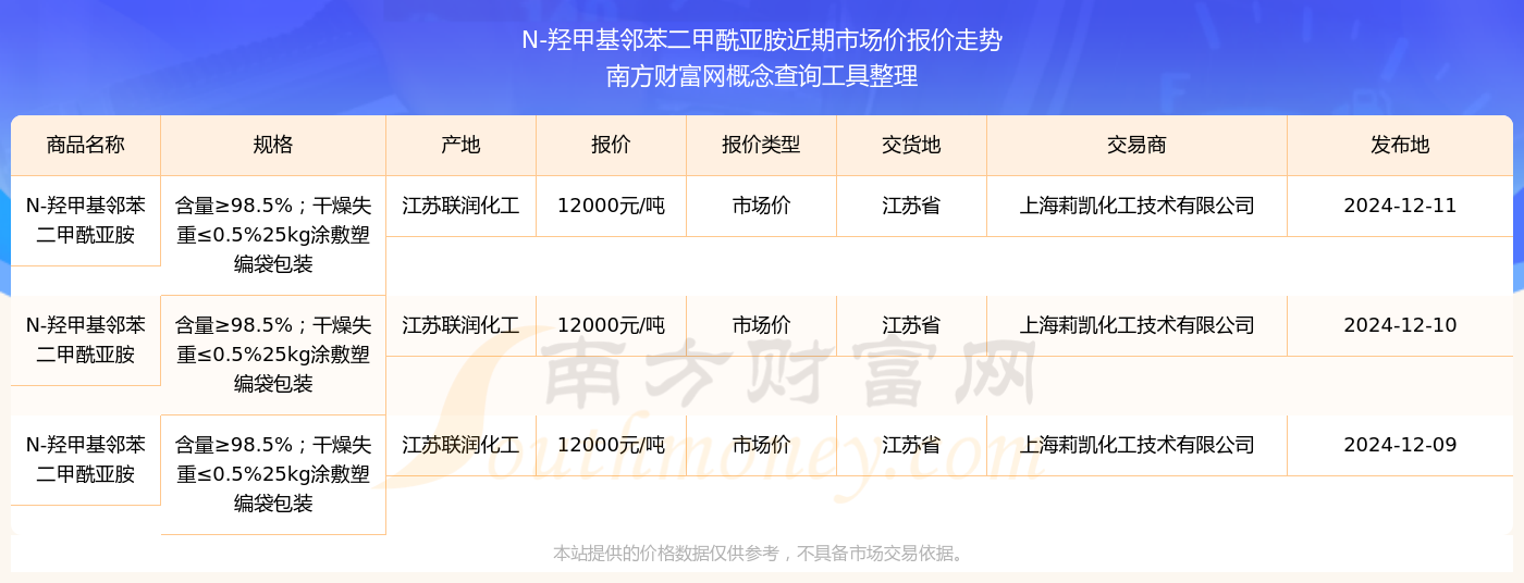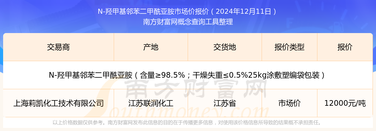 2024年12月11日,上海莉凯化工技术有限公司N-羟甲基邻苯二甲酰亚胺(含量≥98.5%;干燥失重≤0.5%25kg涂敷塑编袋包装),江苏联润化工,交易地点为江苏省,市场价报价为12000.00元/吨。
