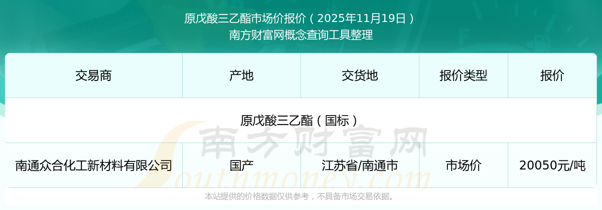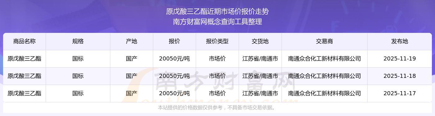 2025年11月19日,南通众合化工新材料有限公司原戊酸三乙酯(国标),国产,交易地点为江苏省/南通市,市场价报价为20050.00元/吨。