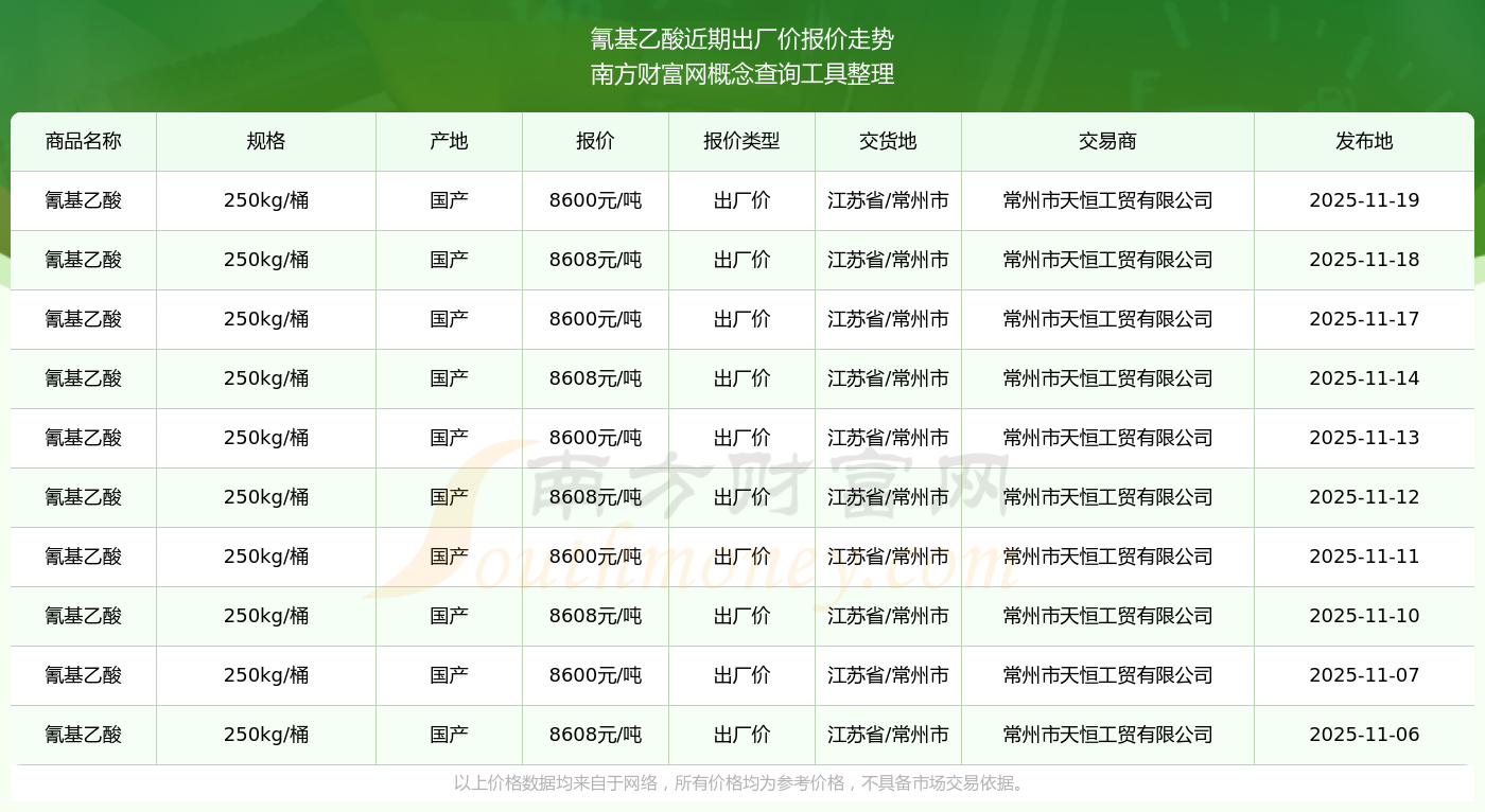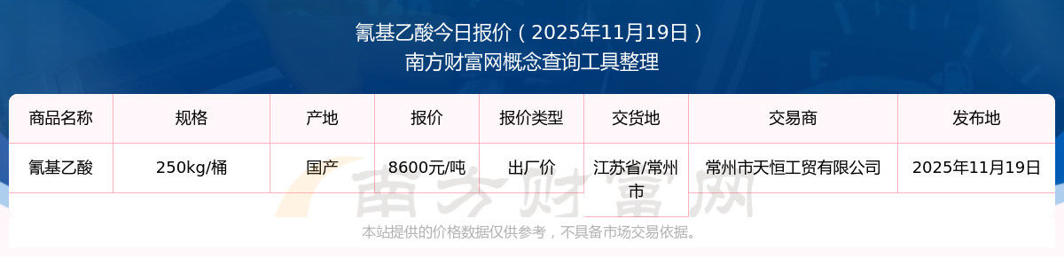 2025年11月19日,常州市天恒工贸有限公司氰基乙酸(250kg/桶),国产,交易地点为江苏省/常州市,出厂价报价为8600.00元/吨。
