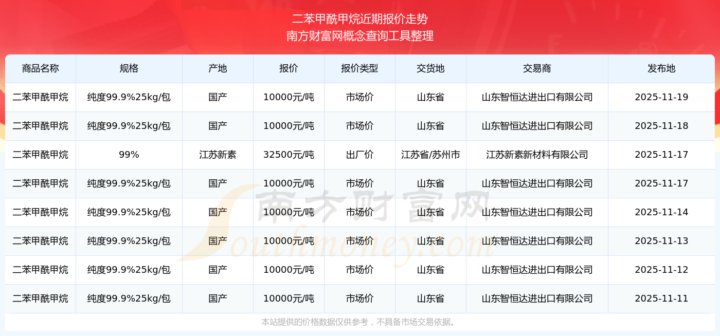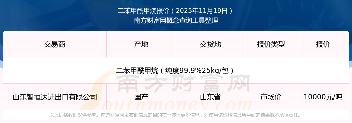 2025年11月19日,二苯甲酰甲烷(纯度99.9%25kg/包)价格为10000.00元/吨,报价人:山东智恒达进出口有限公司,交易地点为山东省。