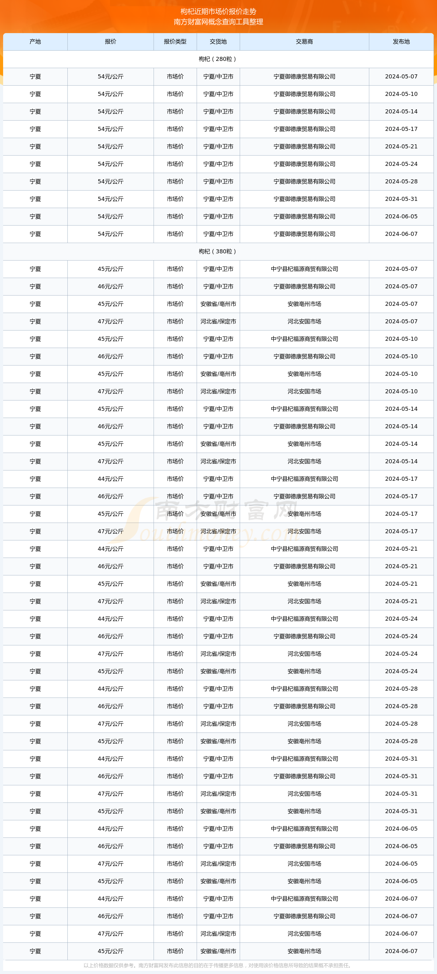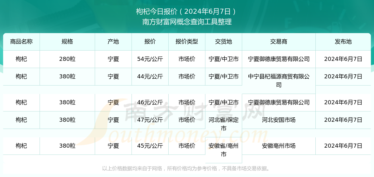 2024年6月7日,枸杞(380粒)市场价价格为44.00元/公斤,报价人:中宁县杞福源商贸有限公司,交易地点为宁夏/中卫市。