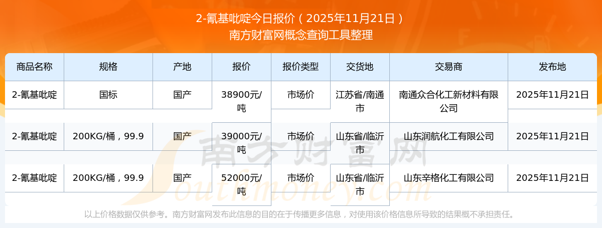 2025年11月21日,2-氰基吡啶(国标)市场价价格为38900.00元/吨,报价人:南通众合化工新材料有限公司,交易地点为江苏省/南通市。