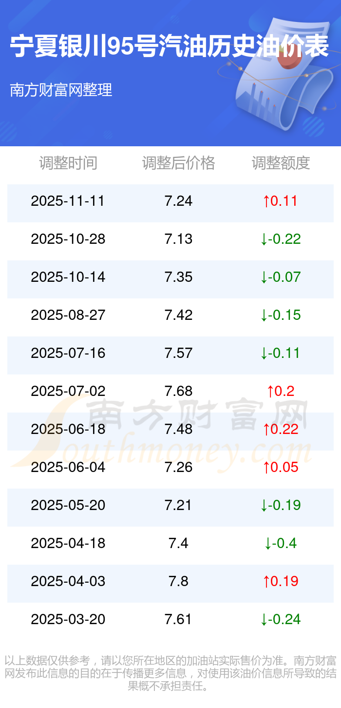 宁夏银川95号汽油11月14日的最新价格(11月11日油价调整后的价格):宁夏银川95号汽油7.24元/升,相对上次调整时间10月28日的油价7.13元每升,增了0.11元,增1.543%。下一轮油价调整时间11月24日24时,距离现在还有10.58天。