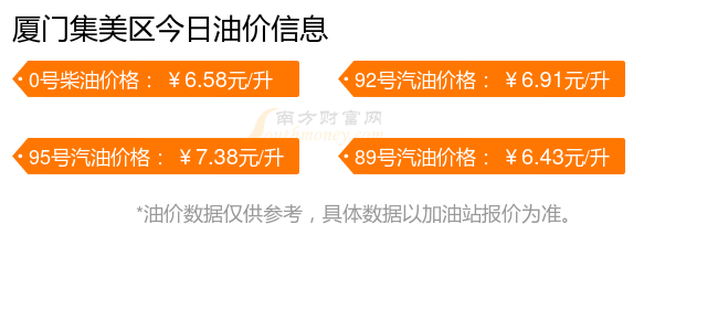11月14日厦门集美区汽油、柴油每升的价格为:92号汽油为6.91元,升了0.1元;95号汽油为7.38元,升了0.11元;89号汽油为6.43元,升了0.09元;0号柴油为6.58元,升了0.11元,本轮油价的调整时间为11月11日。下一轮油价调整时间11月24日24时。