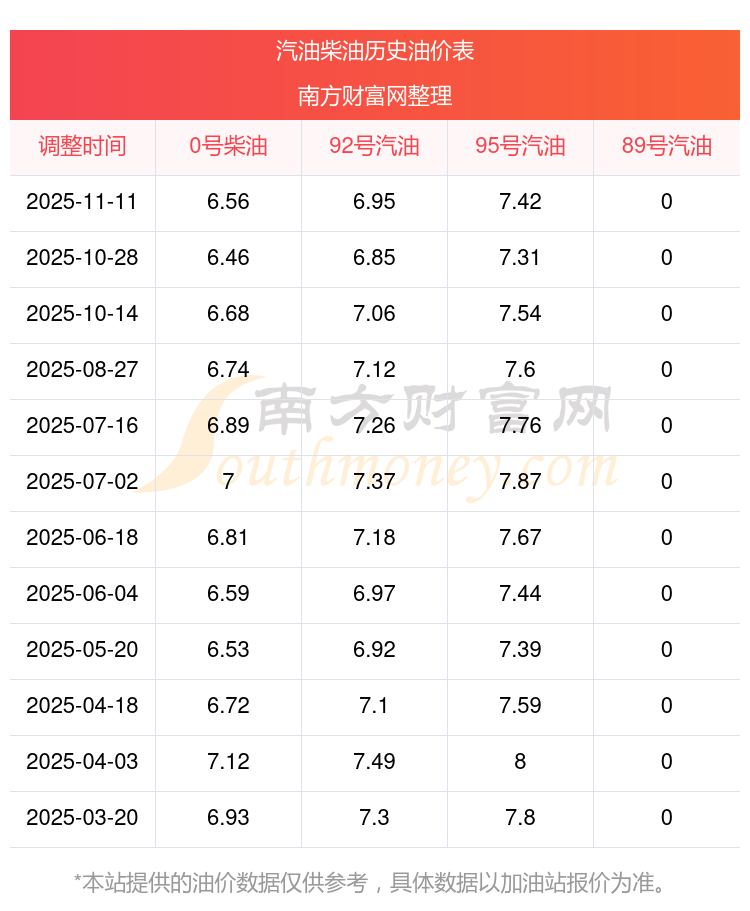 11月14日河南驻马店95号汽油的价格为11月11日油价调整后的价格,具体是每升7.42元,相对上次调整时间10月28日的油价7.31元每升,共上涨了0.11元,上涨1.505%。下一轮油价调整时间11月24日24时,距离现在还有10.57天。