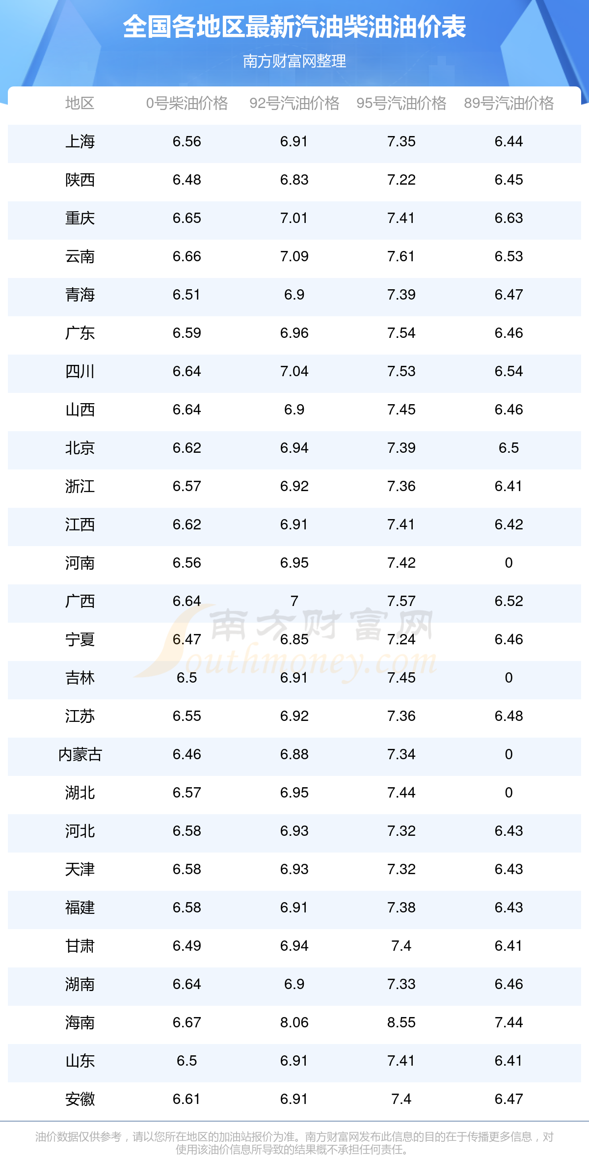 以上油价信息是当前市场上最新油价信息,油价数据仅供参考,实际在售油价可能有小幅偏差,请以您所在地区的加油站实际售价为准。