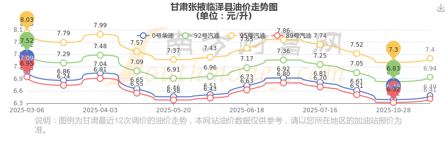 甘肃张掖临泽县汽油柴油11月14日每升的价格为11月11日调整后的价格,各油价详情如下:92号汽油6.94元;95号汽油7.4元;89号汽油6.41元;0号柴油6.49元。
