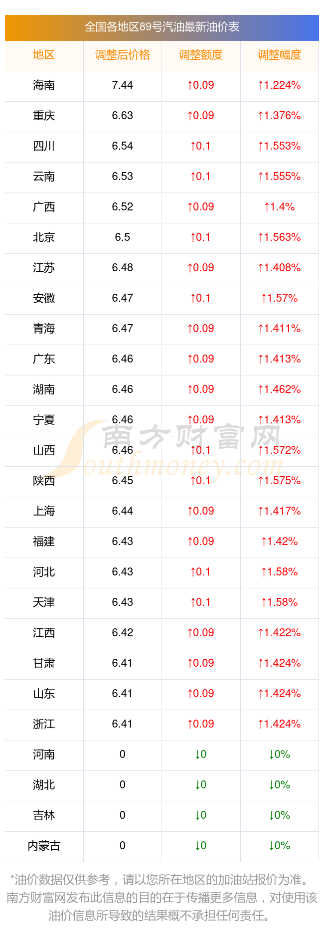 11月15日,广东89号汽油的价格是6.46元每升,本次的调整时间为11月11日,对比上次的调整上调了0.09元,上调1.413%,下次调整时间为11月24日24时,还有9.96天。