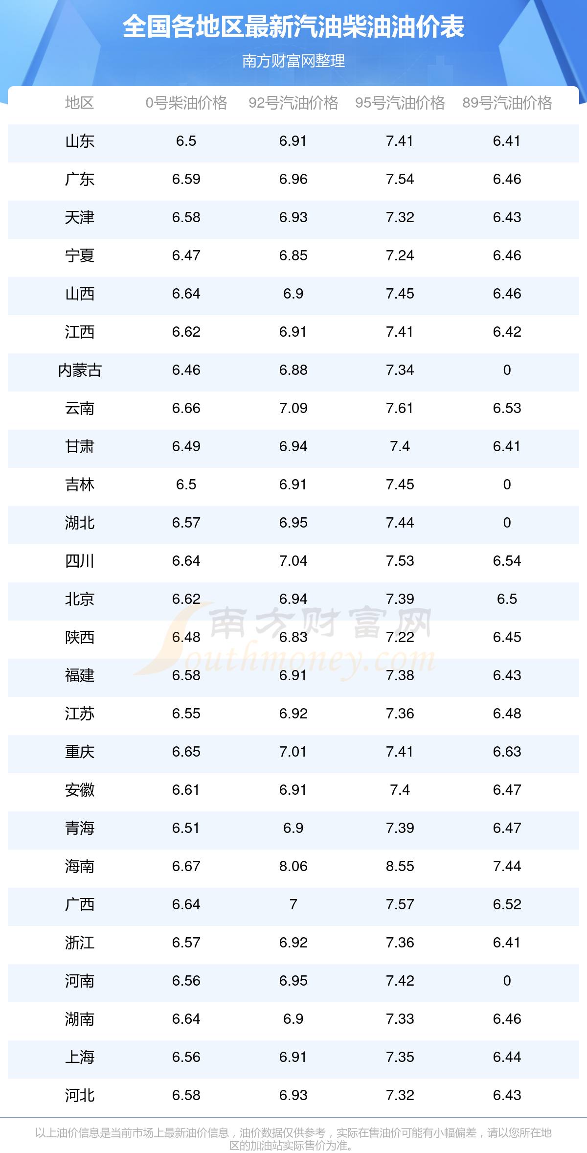 以上油价信息是当前市场上最新油价信息,油价数据仅供参考,实际在售油价可能有小幅偏差,请以您所在地区的加油站实际售价为准。