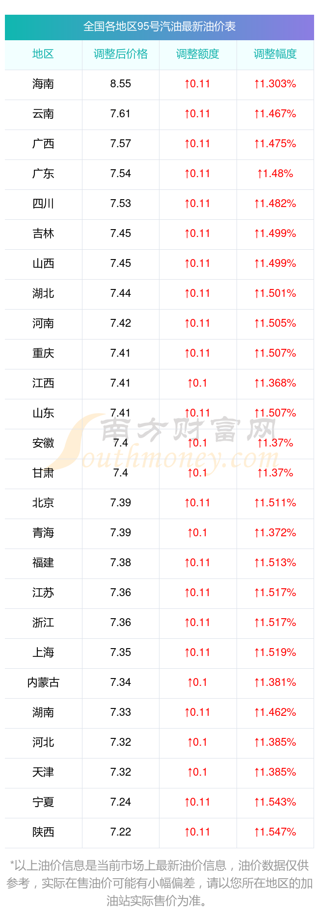 以上油价信息是当前市场上最新油价信息,油价数据仅供参考,实际在售油价可能有小幅偏差,请以您所在地区的加油站实际售价为准。