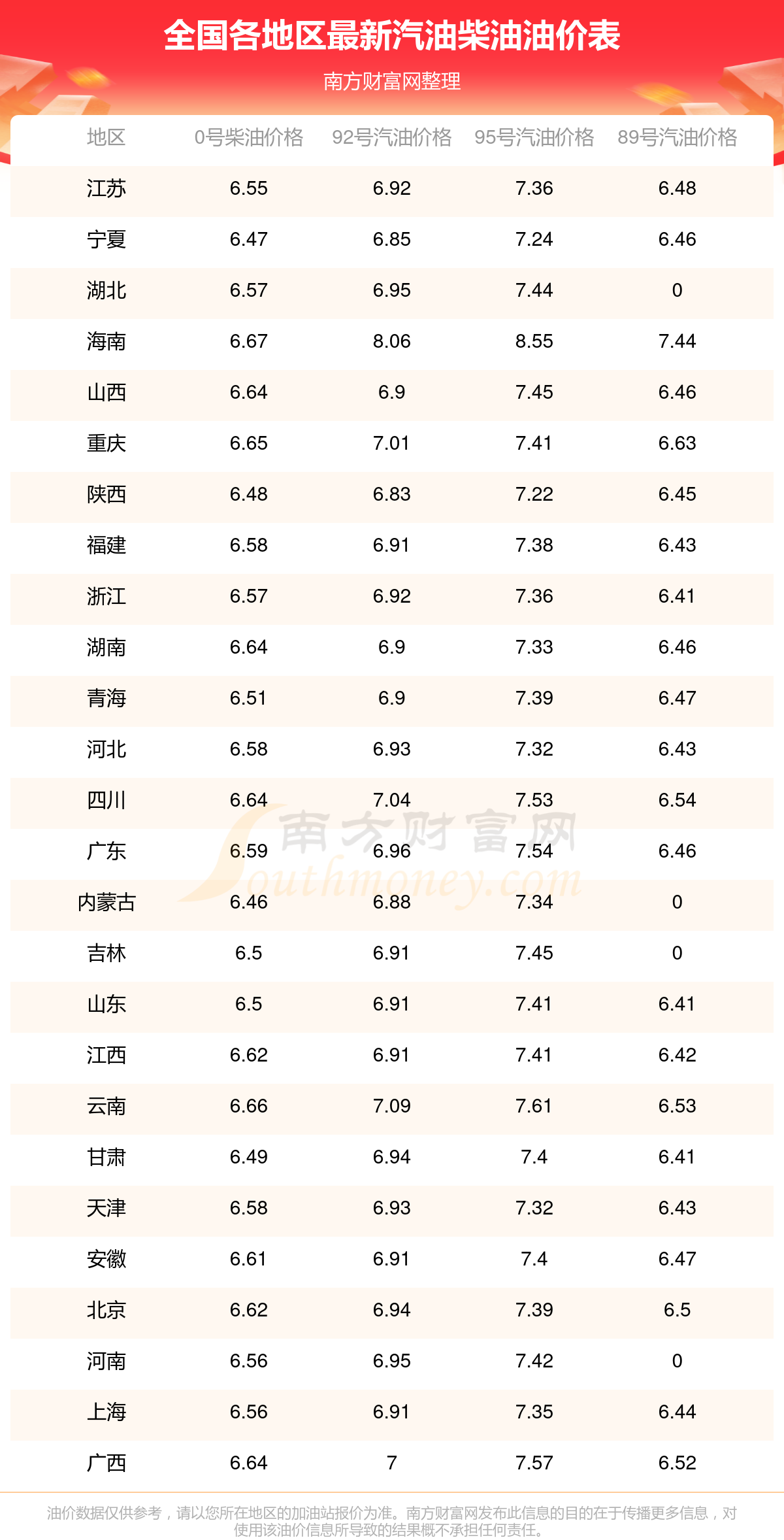 油价数据仅供参考,请以您所在地区的各加油站报价为准。