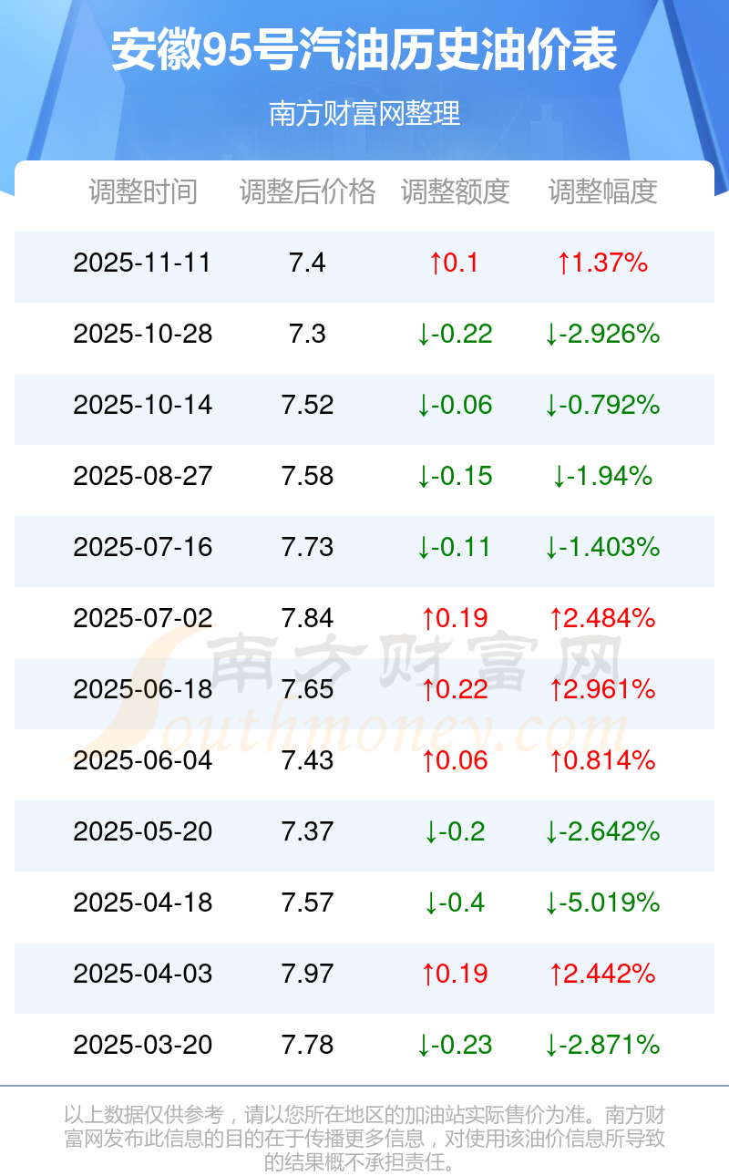 11月15日,安徽95号汽油的价格是7.4元每升,本次的调整时间为11月11日,对比上次的调整涨了0.1元,涨1.37%,11月24日24时为下一轮油价调整时间,还有9.77天。