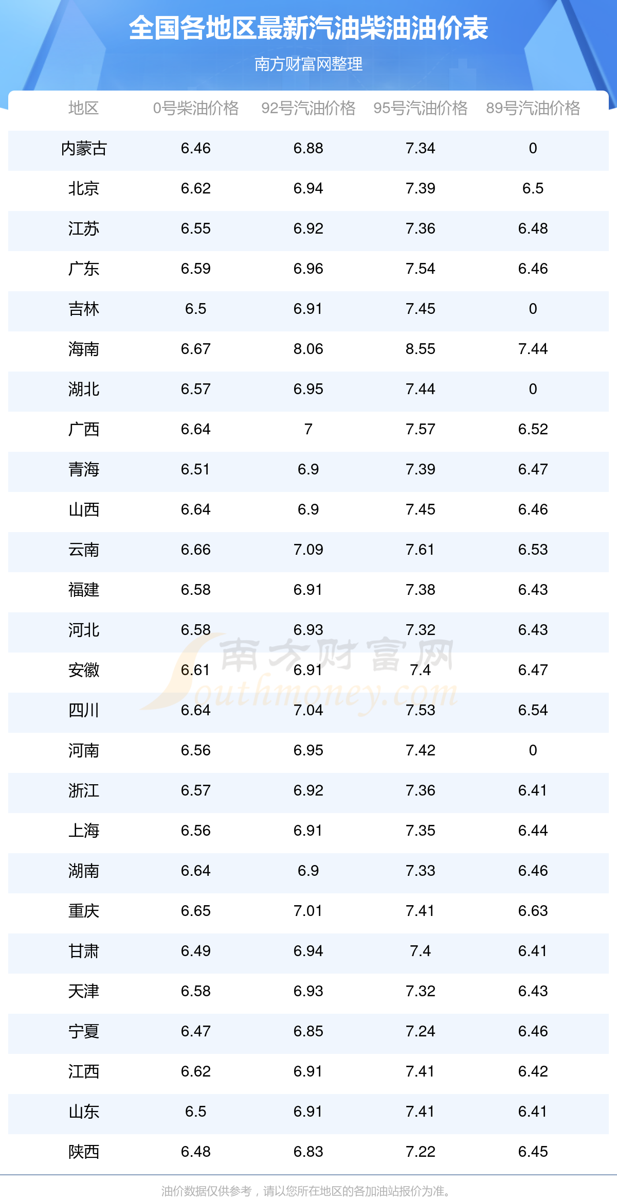 以上油价信息是当前市场上最新油价信息,油价数据仅供参考,实际在售油价可能有小幅偏差,请以您所在地区的加油站实际售价为准。