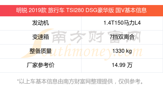 在动力方面,明锐 2019款 旅行车 TSI280 DSG豪华版 国V搭载的是一台1.4T150马力L4涡轮增压发动机,匹配7挡双离合自动档变速箱,燃料形式为汽油,常规整备质量1330kg,厂家参考价14.99万元。