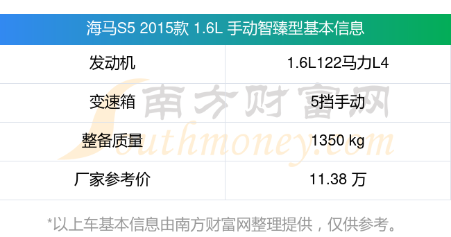 海马S5 2015款 1.6L 手动智臻型动力上搭载的是一台1.6L122马力L4自然吸气发动机,匹配5挡手动挡变速箱,燃料形式为汽油,常规整备质量1350kg,厂家参考价11.38万元。
