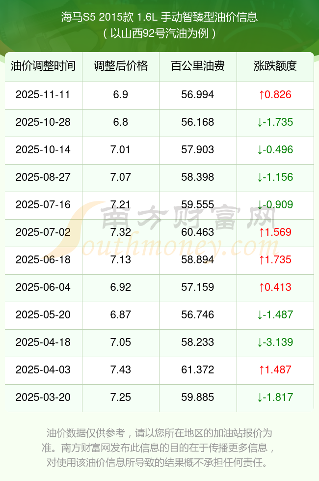 根据11月11日92号汽油最新调整价格6.9元/升来计算(以山西为例),该车型每百公里的平均油费是56.994元,上一轮10月28日调整价格6.8元每升来计算,每百公里的平均油费是56.168元,对比上一轮多花0.826元,下一轮的油价调整时间是11月24日24时。