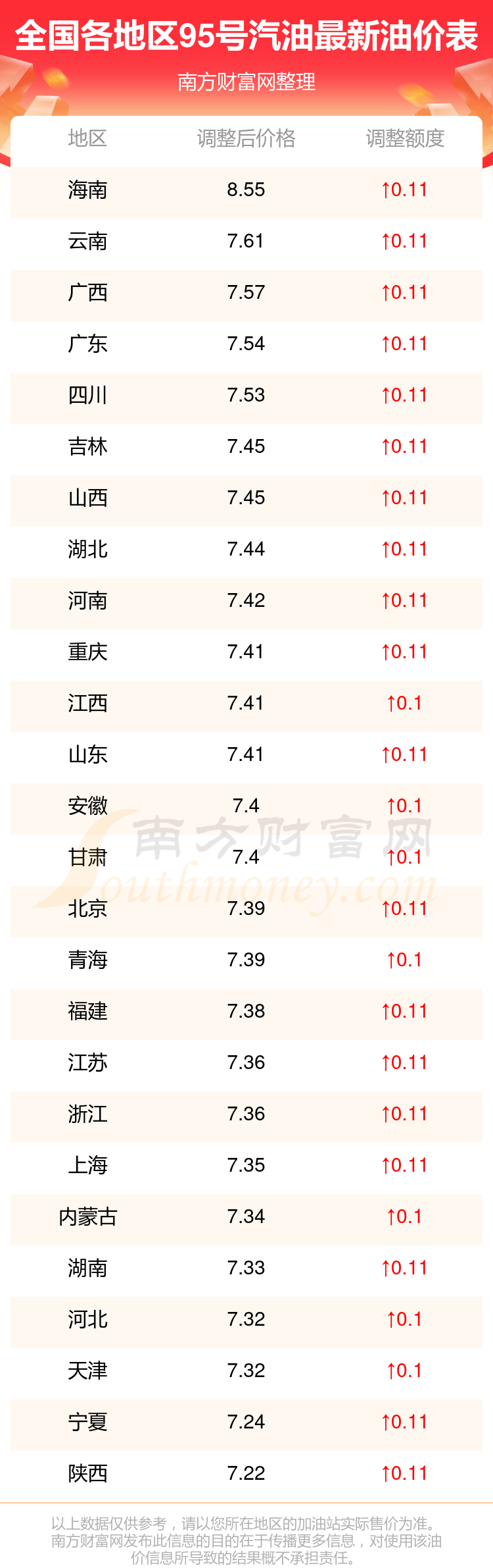 全国95号汽油最新平均价格为:7元每升,其中,最低为陕西,价格为7.22元/升,最高为海南,价格为8.55元/升。