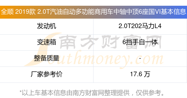 在动力上,全顺 2019款 2.0T汽油自动多功能商用车中轴中顶6座国VI配备的是一台2.0T202马力L4涡轮增压发动机,匹配的是6挡手自一体自动档变速箱,燃料形式为汽油,厂家参考价17.6万元。