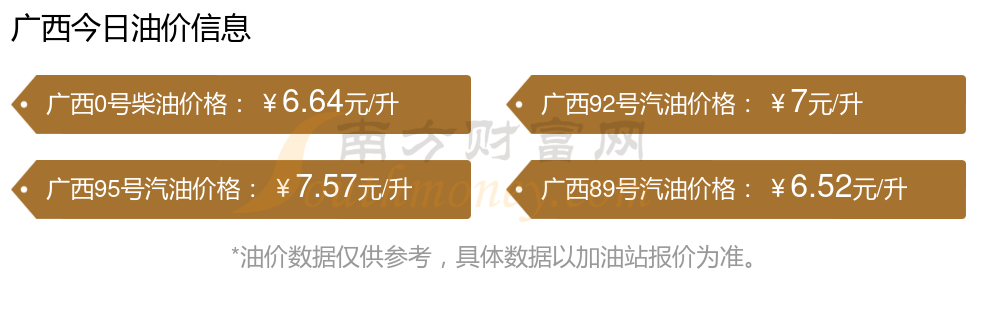 11月15日,广西0号柴油的价格是6.64元每升,本次的调整时间为11月11日,对比上次的调整上升了0.1元,上升1.529%,11月24日24时为下一轮油价调整时间,还有9.67天。