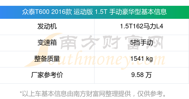 众泰T600 2016款 运动版 1.5T 手动豪华型动力上配备的是一台1.5T162马力L4涡轮增压发动机,匹配的是5挡手动挡变速箱,燃料形式为汽油,常规整备质量1541kg,厂家参考价9.58万元。