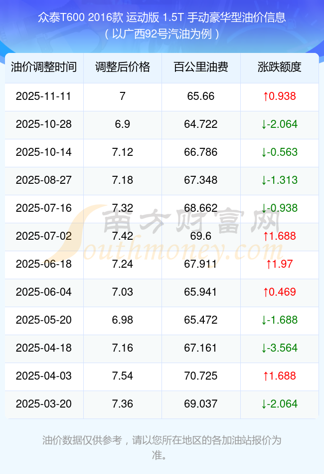 根据11月11日92号汽油最新调整价格7元/升来计算(以广西为例),该车型每百公里的平均油费是65.66元,上一轮10月28日调整价格6.9元每升来计算,每百公里的平均油费是64.722元,对比上一轮多花0.938元,下一轮的油价调整时间是11月24日24时。