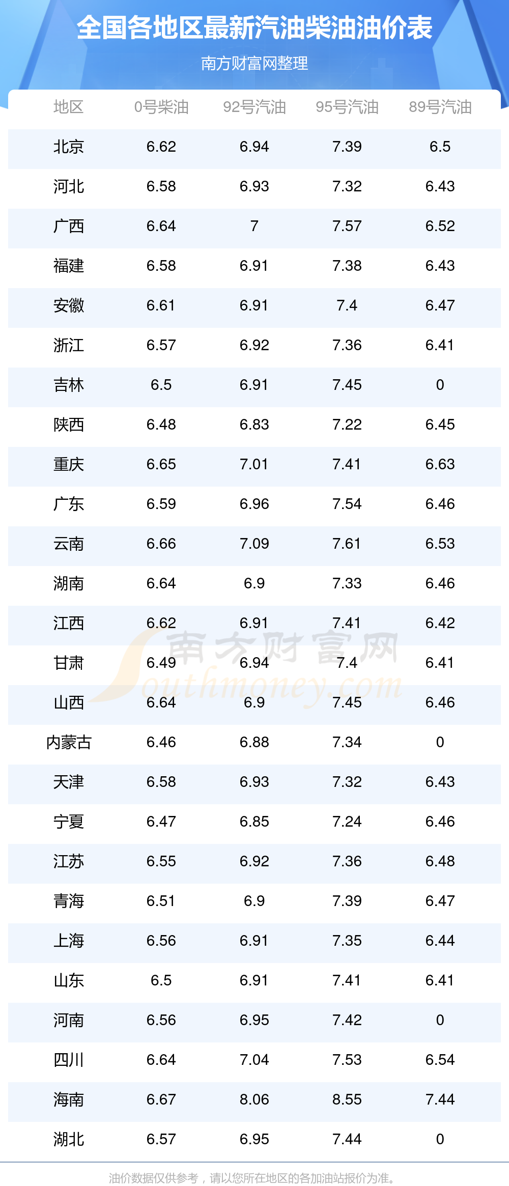 2025年11月15日全国各地油价调整及最新汽油价格表