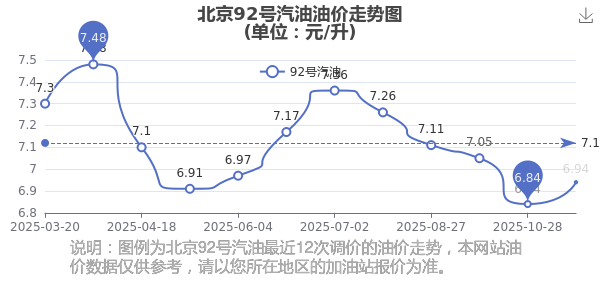 油价调整最新消息:北京汽油、柴油11月15日每升的价格为11月11日调整后的价格,具体油价为:92号汽油6.94元;95号汽油7.39元;89号汽油6.5元;0号柴油6.62元。北京下一轮油价调整时间11月24日24时,距离现在还有9.65天。
