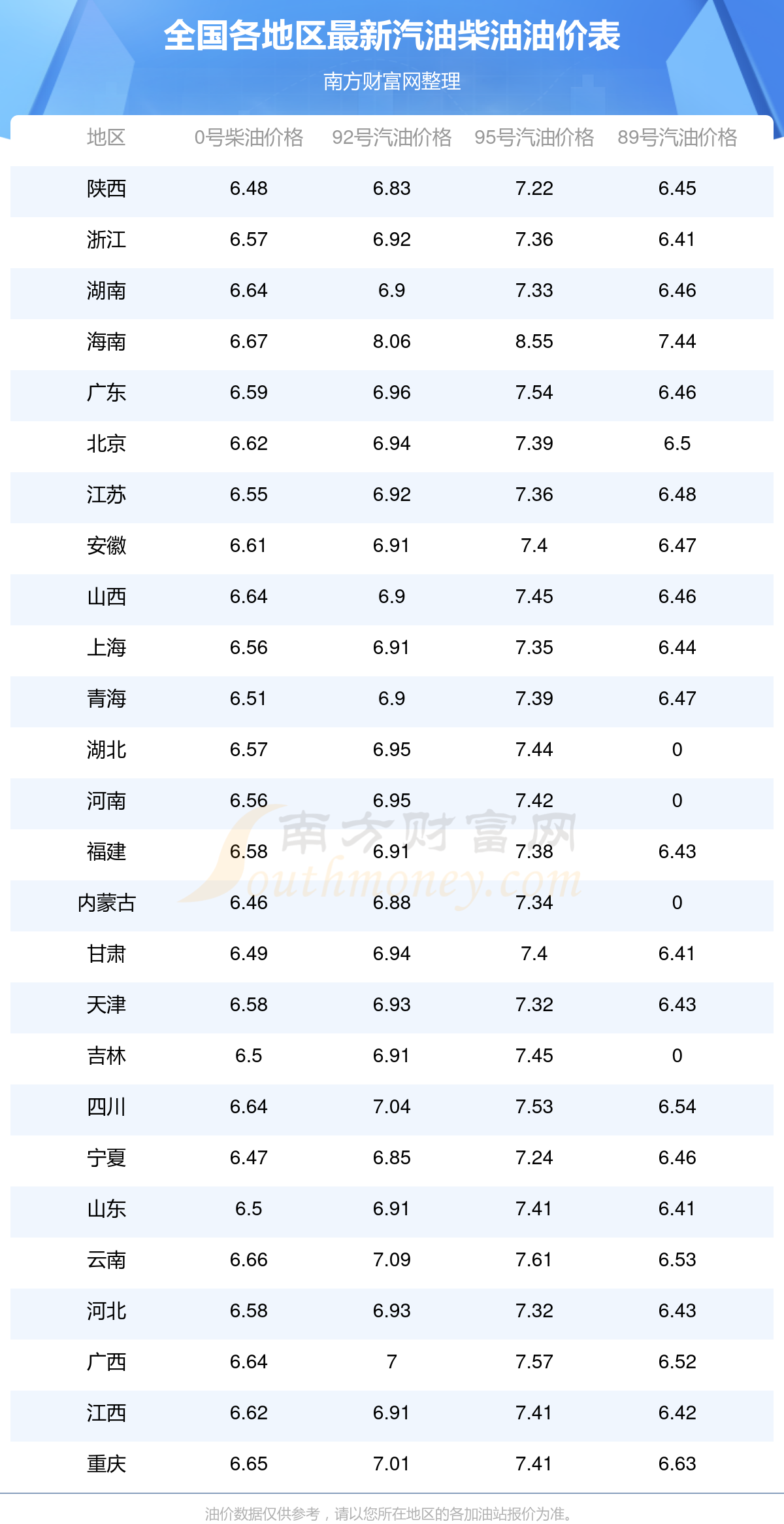 油价数据仅供参考,请以您所在地区的各加油站报价为准。