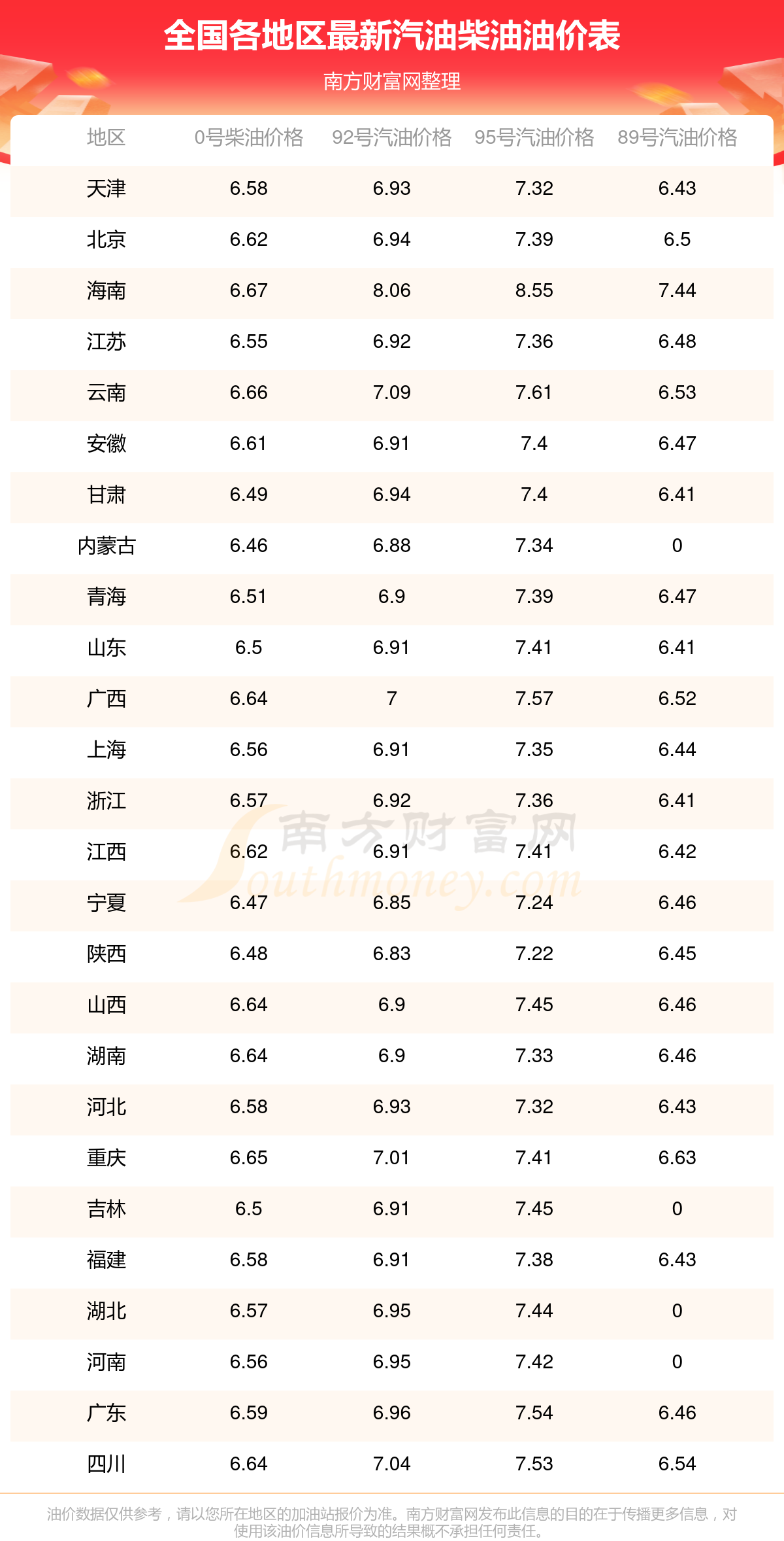2025年11月15日全国油价调整及最新汽油价格表
