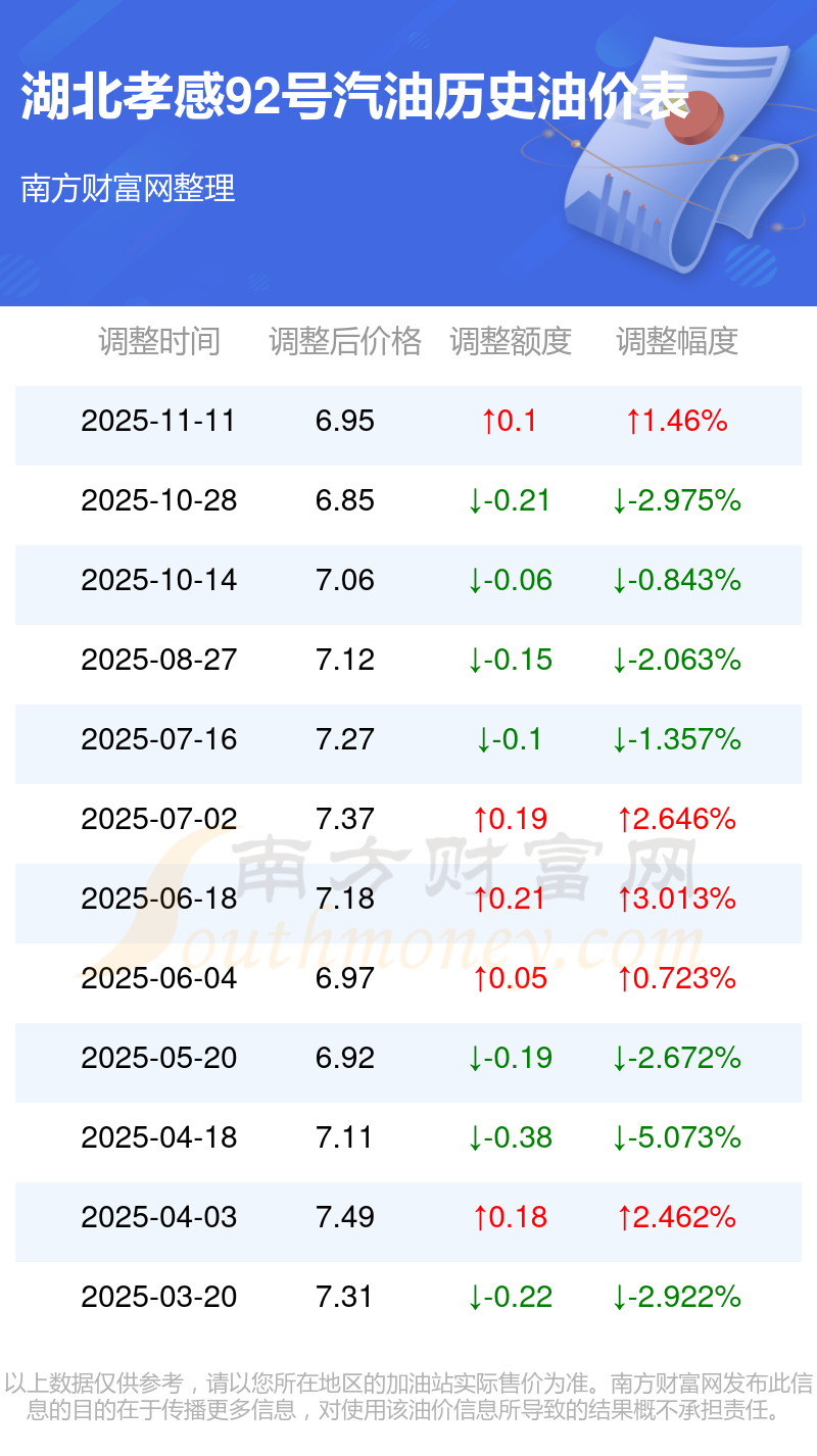 2025年92号汽油价格调整一览表