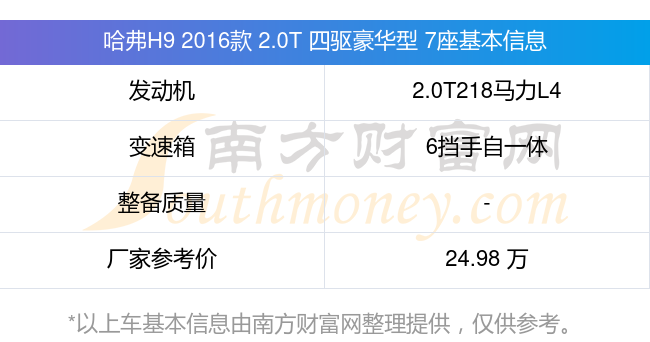哈弗H9 2016款 2.0T 四驱豪华型 7座动力上搭载的是一台2.0T218马力L4涡轮增压发动机,匹配6挡手自一体自动档变速箱,燃料形式为汽油,厂家参考价24.98万元。