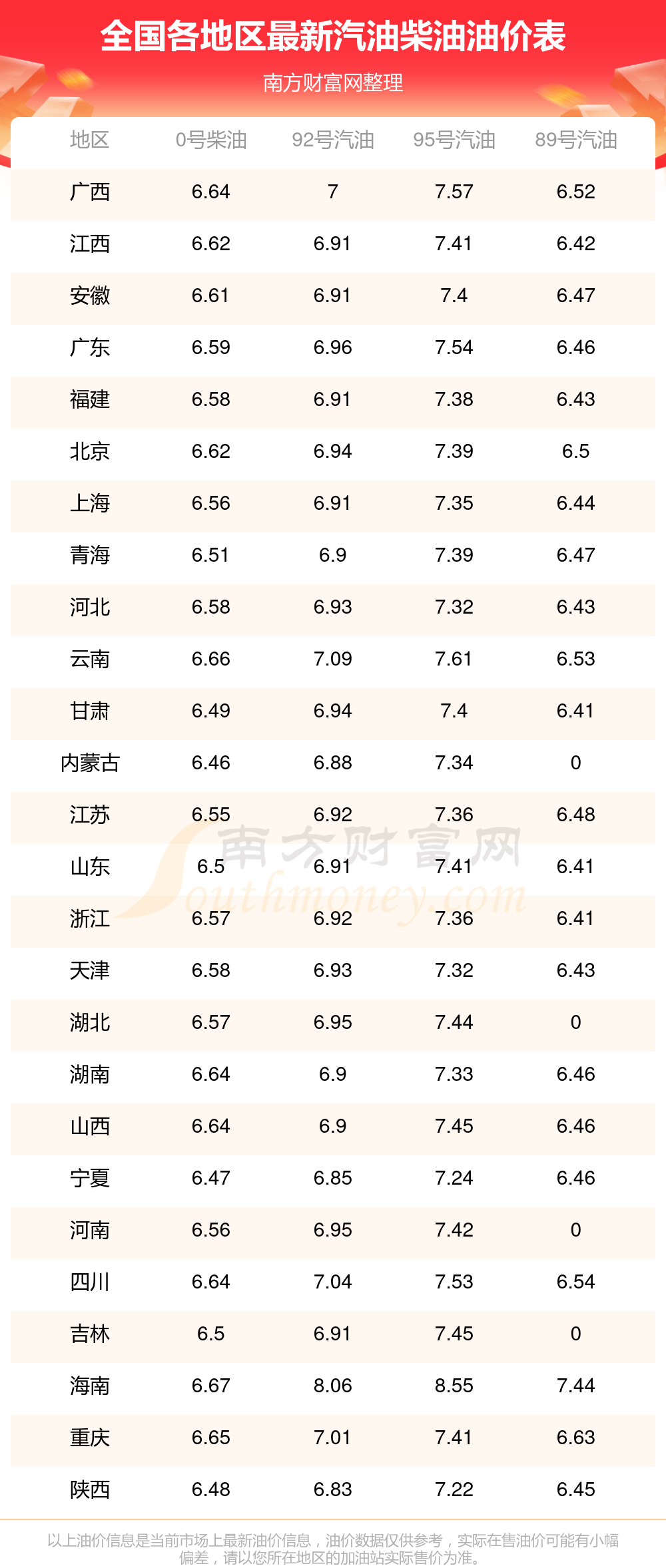 全国89号汽油平均价格为:7元每升,其中,最低为浙江,价格6.41元/升,最高为海南,价格7.44元/升。