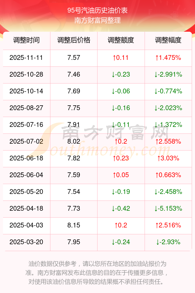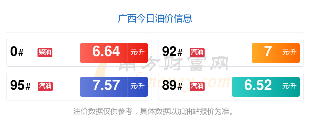 汽油价格调整最新消息:下一轮油价调整时间11月24日24时。11月15日广西汽油、柴油每升的价格是多少?11月11日为本轮油价调整时间,92号汽油7元,上调了0.1元,上调幅达1.45%;95号汽油7.57元,上调了0.11元,上调幅达1.48%;89号汽油6.52元,上调了0.09元,上调幅达1.4%;0号柴油6.64元,上调了0.1元,上调幅达1.53%。