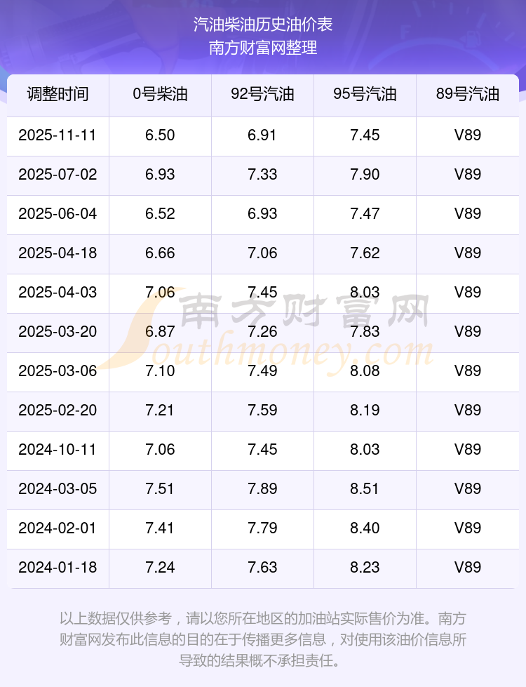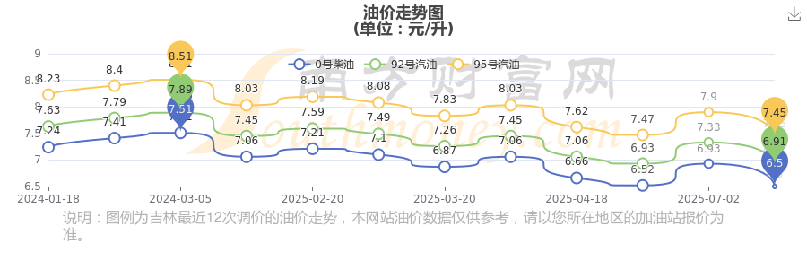 吉林92号汽油11月15日的最新价格为6.91元/升,调整时间为11月11日,相对上次调整升了0.11元。下一轮油价调整时间11月24日24时,距离现在还有9.62天。