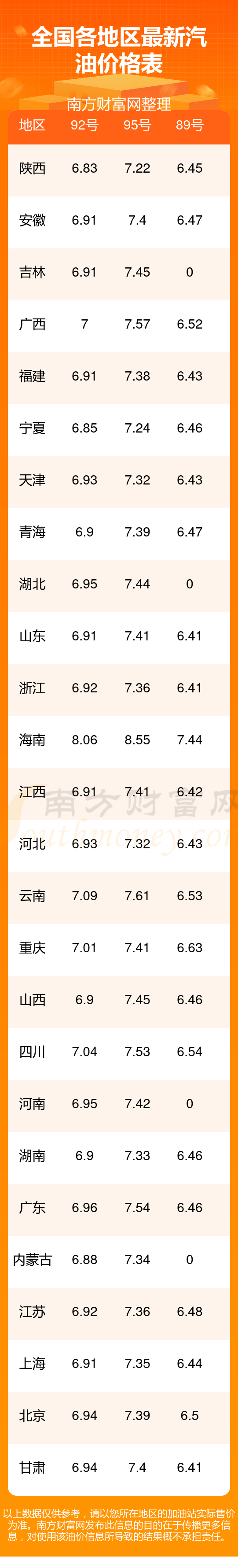 全国92号汽油最新平均价格为:7元每升,其中,最低为陕西,价格为6.83元/升,最高为海南,价格为8.06元/升。
