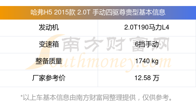 哈弗H5 2015款 2.0T 手动四驱尊贵型动力上配备的是一台2.0T190马力L4涡轮增压发动机,匹配的是6挡手动挡变速箱,燃料形式为汽油,常规整备质量1740kg,厂家参考价12.58万元。