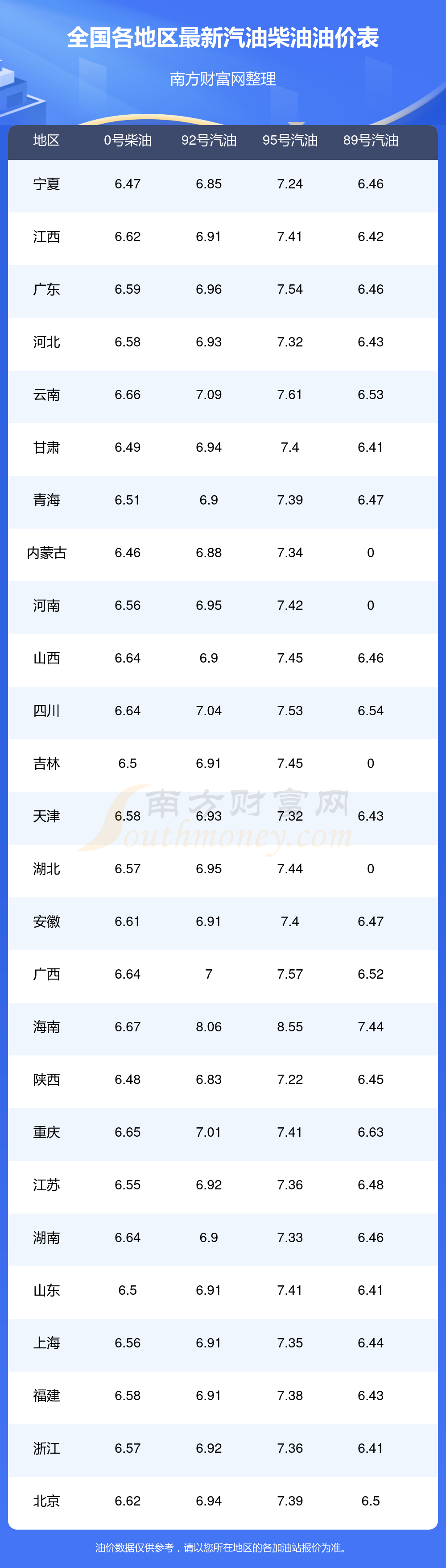 全国各地区最新油价表