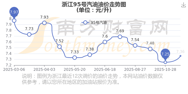 11月15日,浙江95号汽油的价格是7.36元每升,本次的调整时间为11月11日,对比上次的调整涨了0.11元,涨1.517%,11月24日24时为下一轮油价调整时间,还有9.6天。