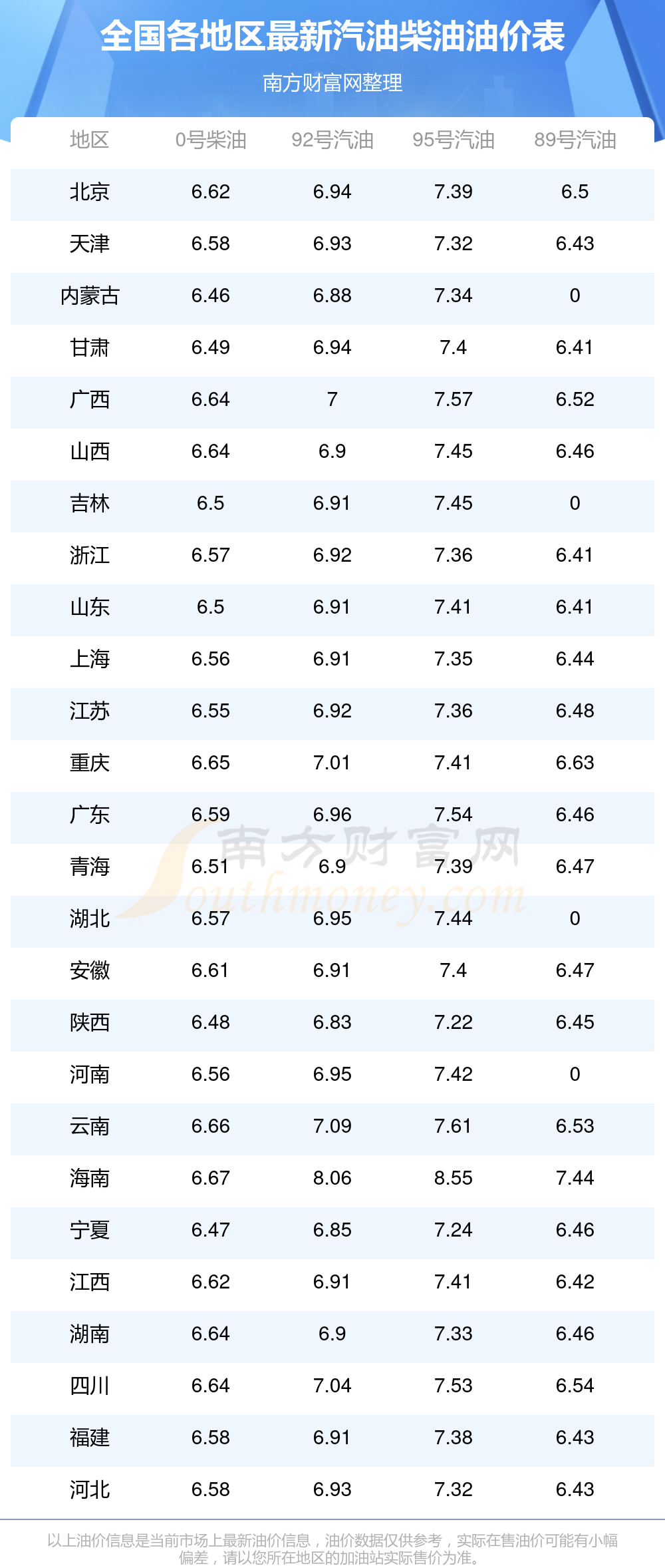 2025年11月15日全国各地汽油价格调整时间及价格一览表