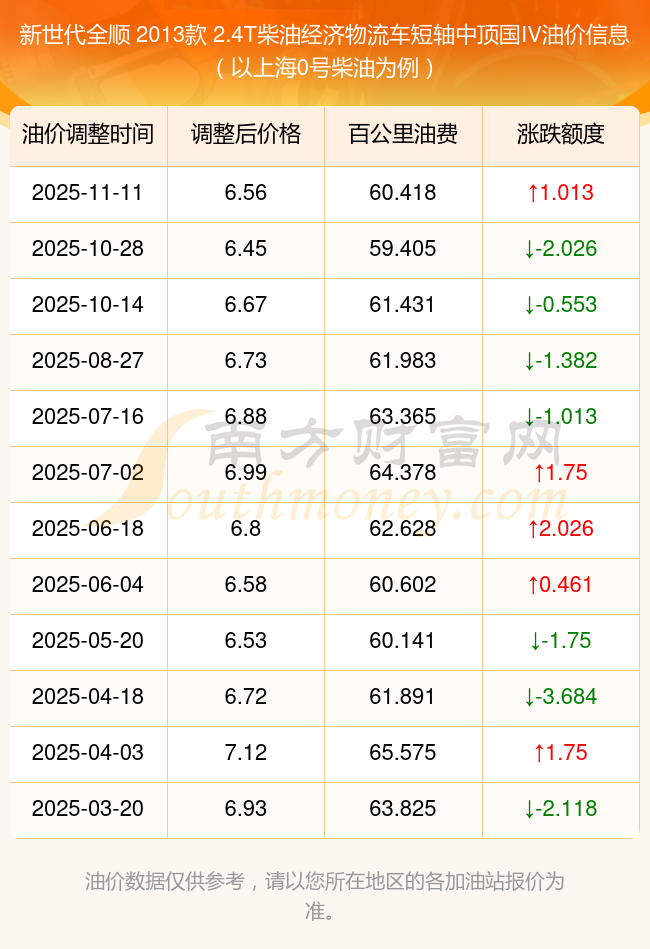 依照11月11日0号柴油最新调整价格6.56元/升来计算(以上海为例),该车型百公里的平均油费是60.418元,依照上一轮10月28日调整价格6.45元/升来计算,百公里的平均油费是59.405元,对比上一轮多花1.013元,下一轮的油价调整时间11月24日24时。