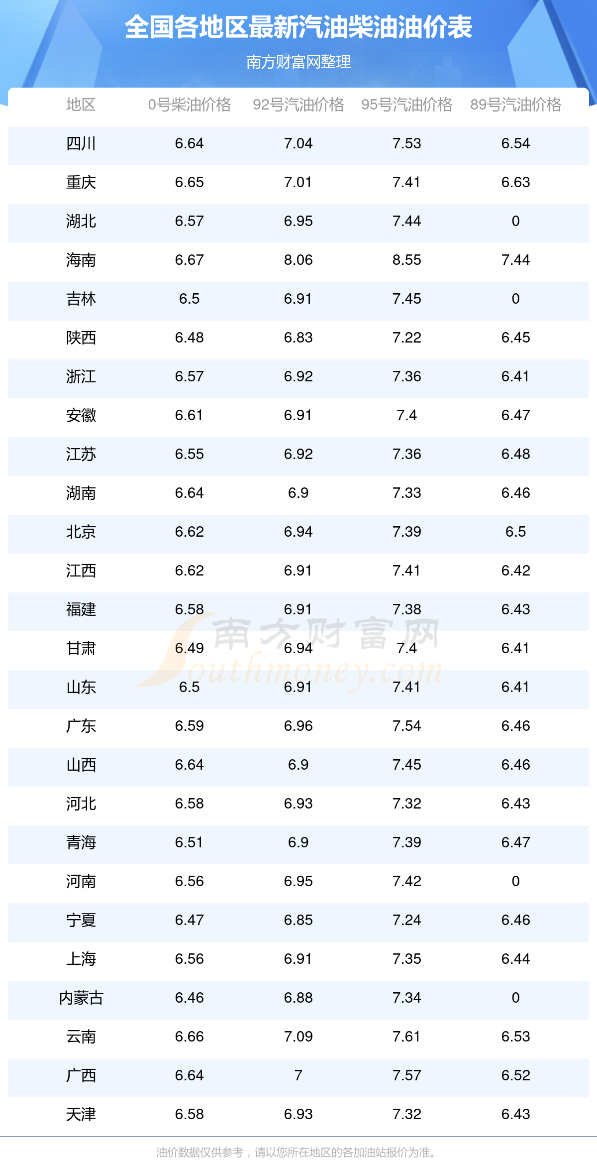 油价数据仅供参考,请以您所在地区的各加油站报价为准。
